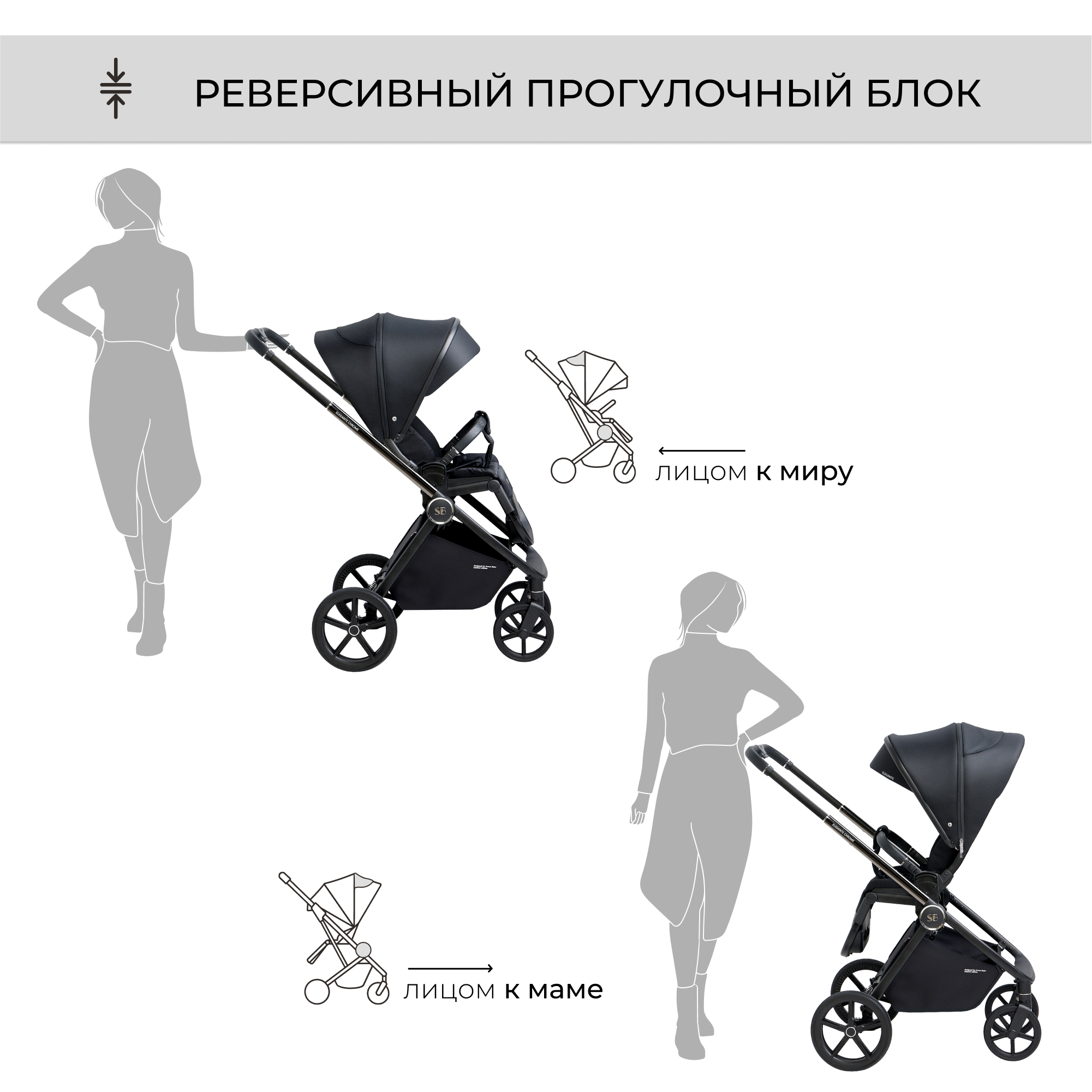✔ установить прогулочный блок на шасси также легко, как по ходу движения (лицом к родителю), так и лицом к миру;
