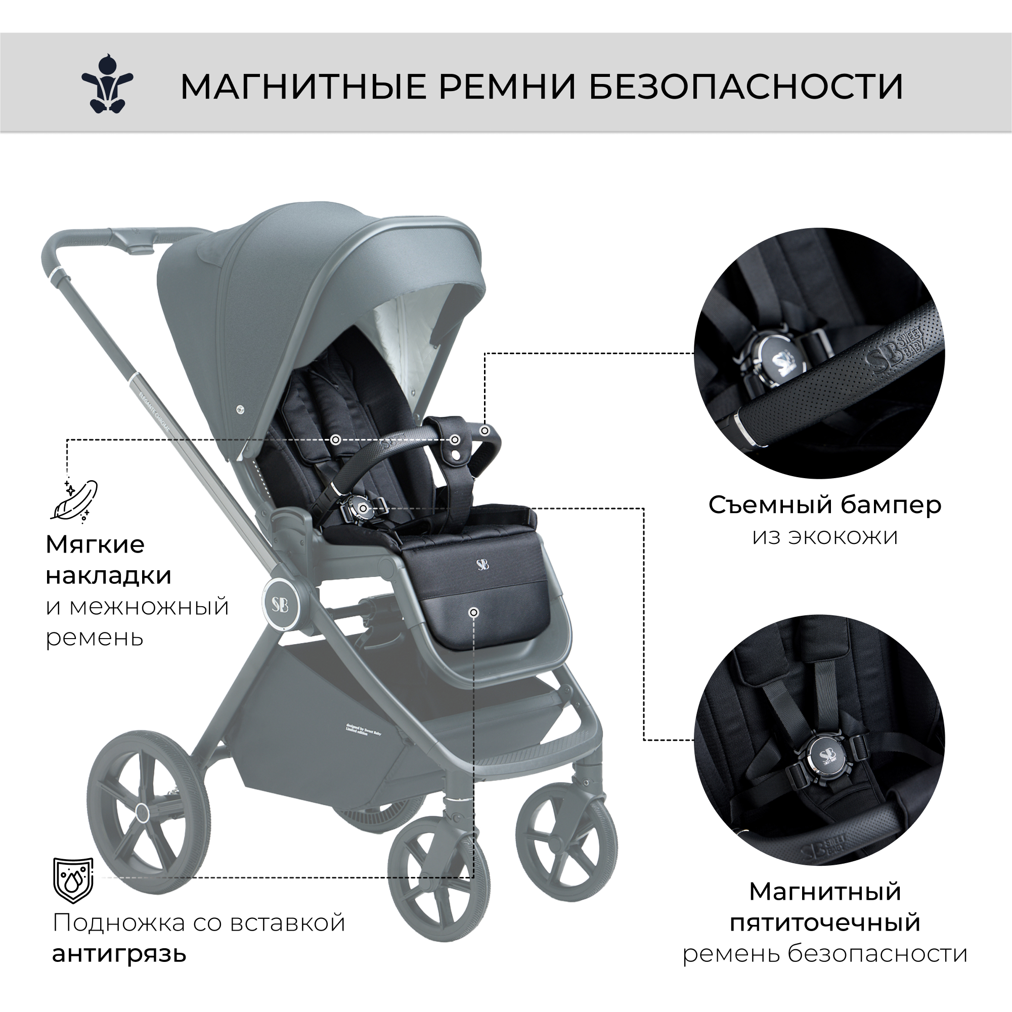 ✔ благодаря пятиточечными ремням безопасности с магнитным замком ваш малыш будет всегда в безопасности;