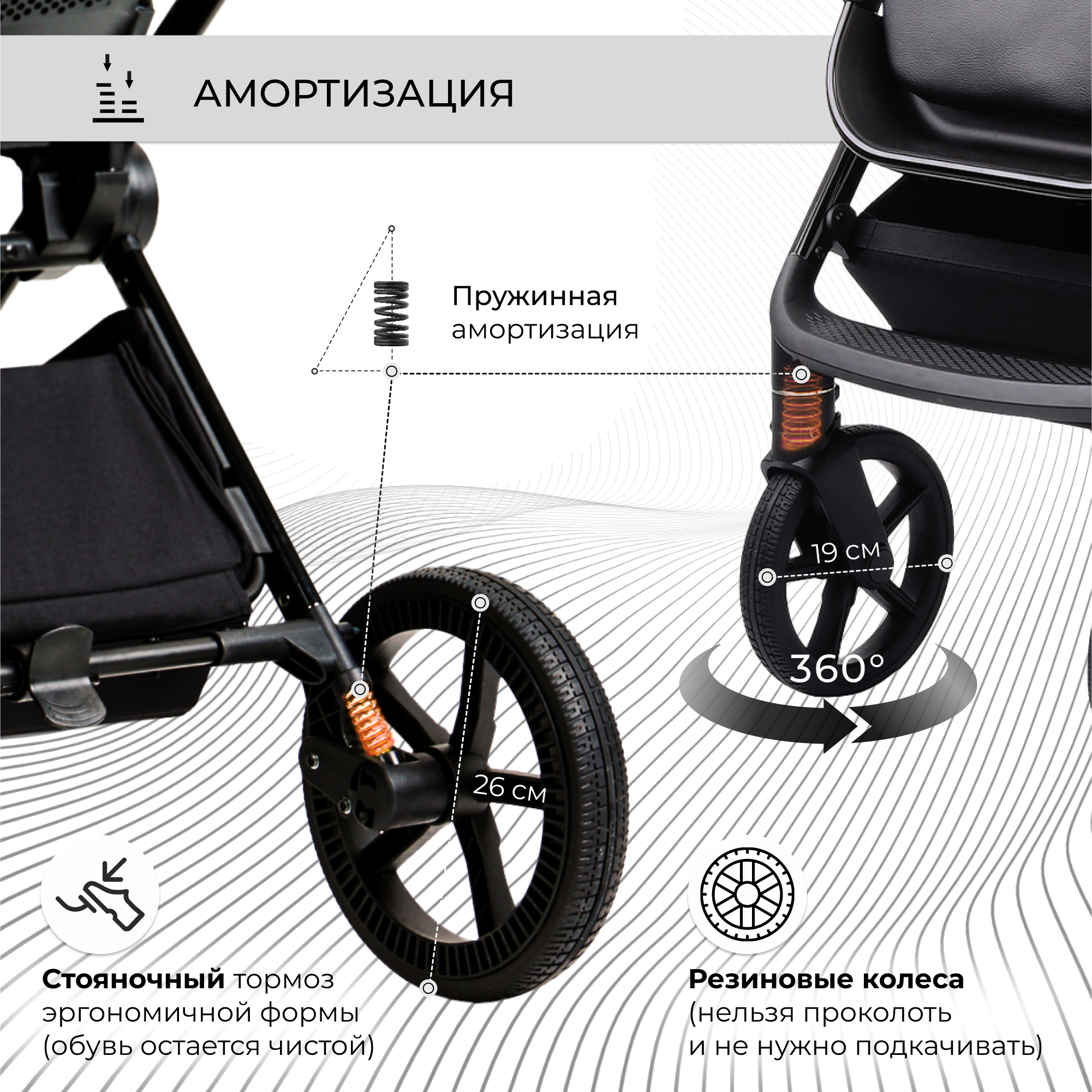 ✔ система амортизации передних колес и мягкие пружины на задней оси обеспечивают плавный ход, по неровным дорогам;