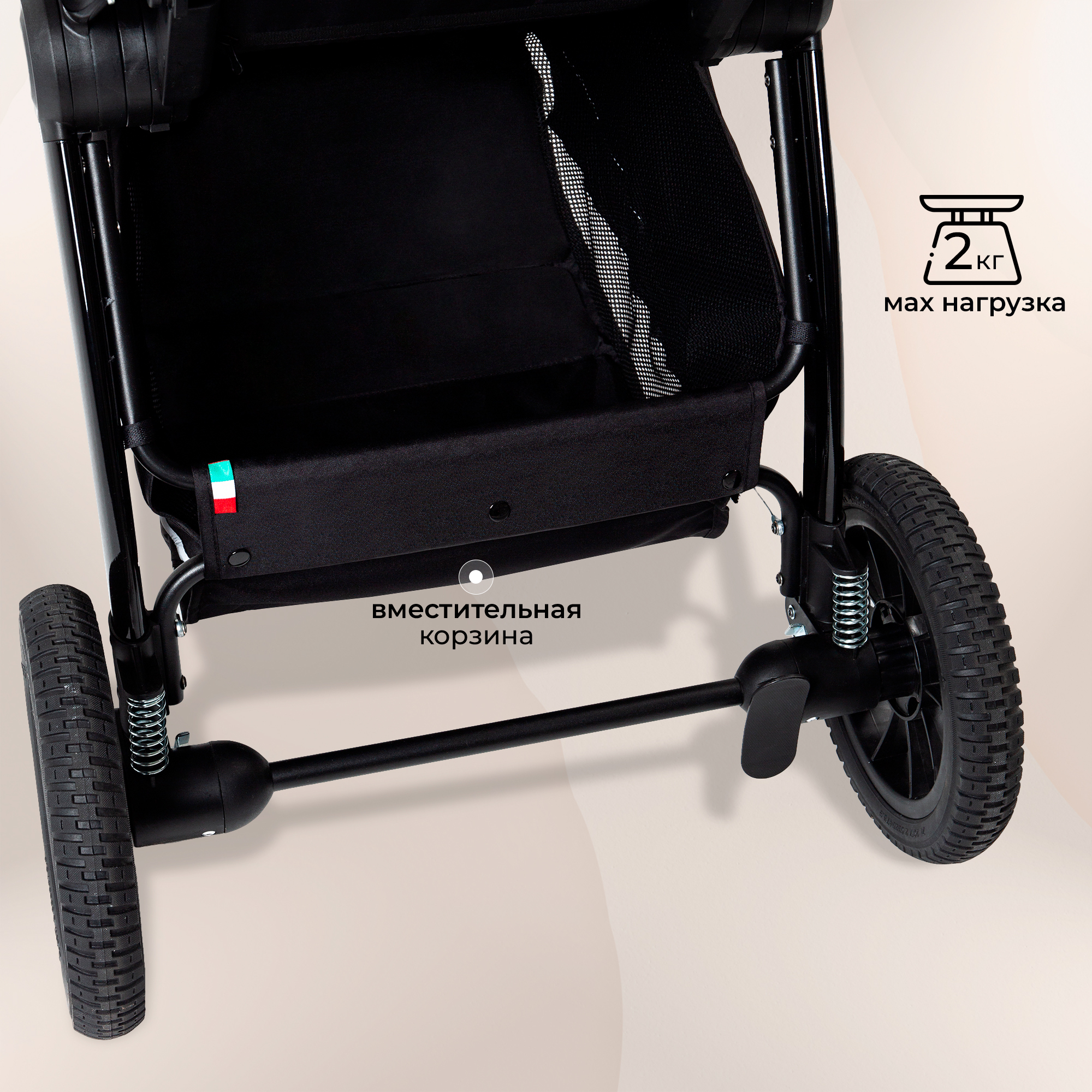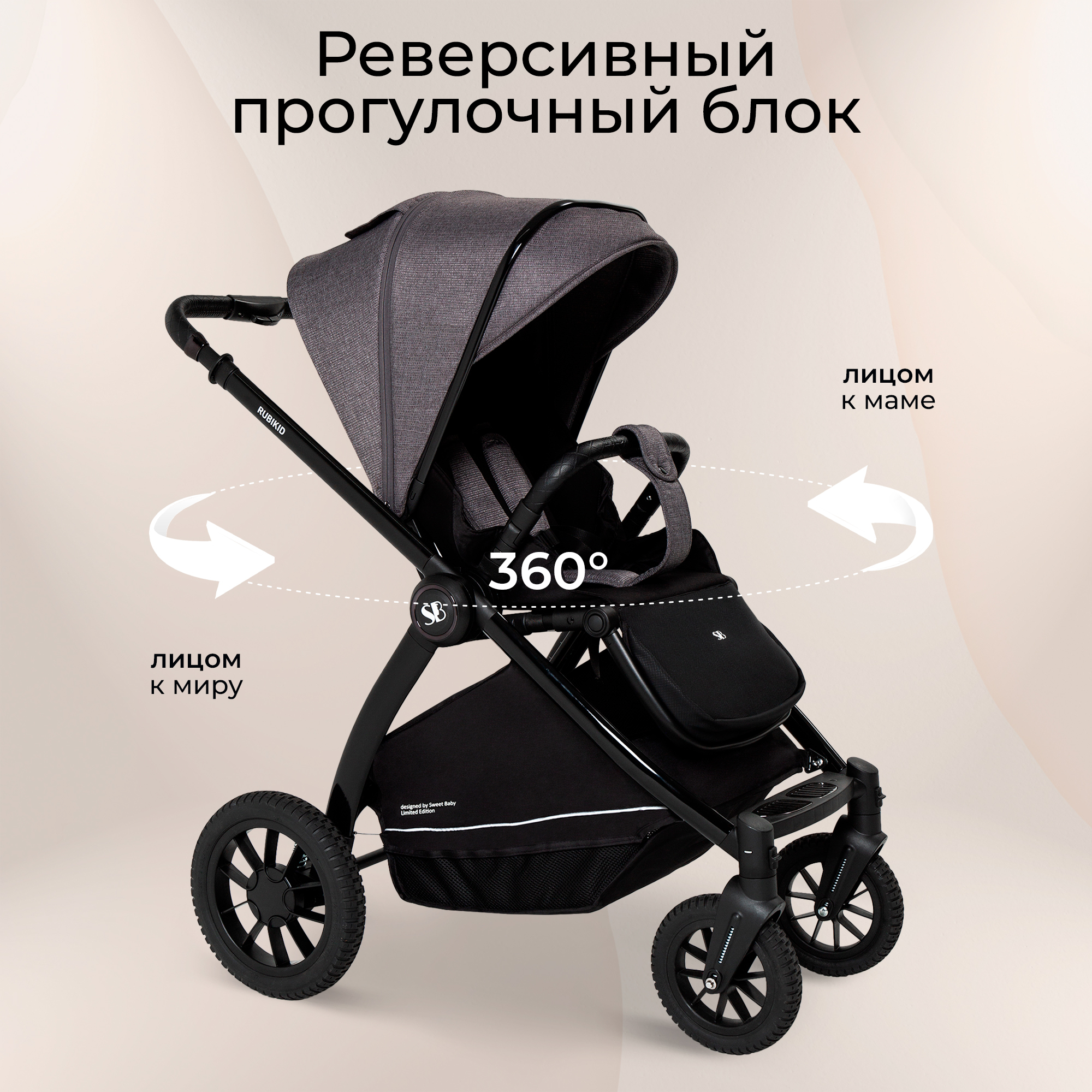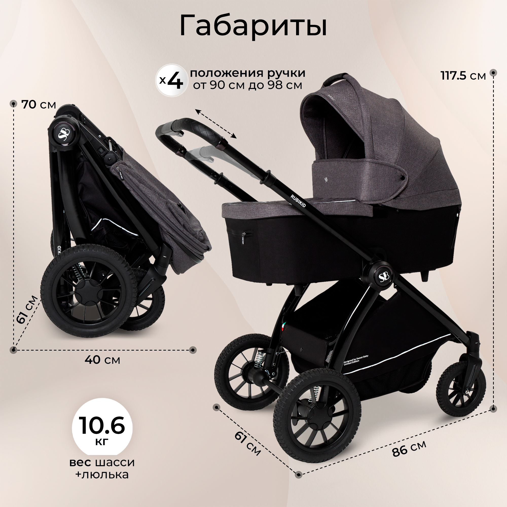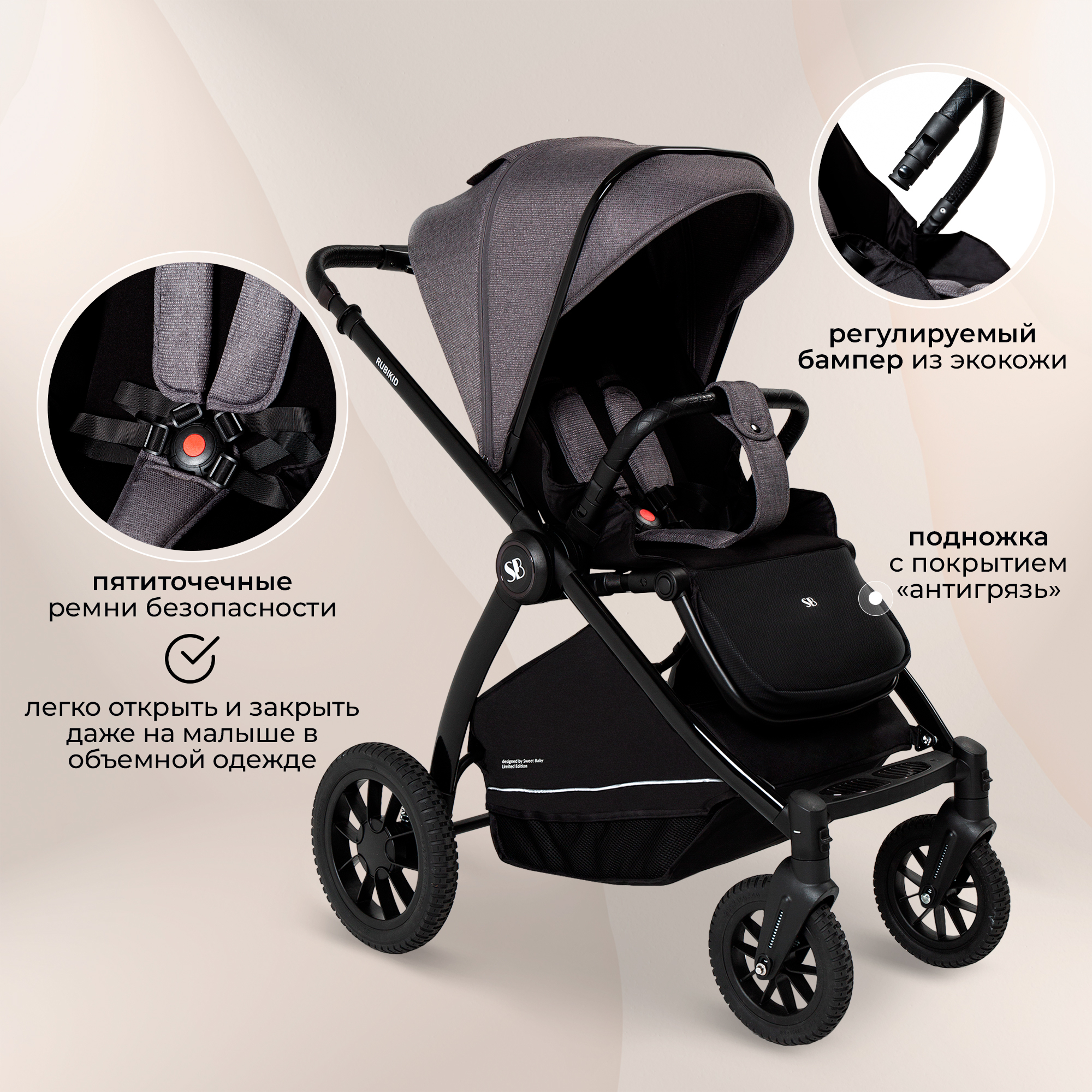 - благодаря большим непрокалываемым резиновым колесам и мягкой пружинной амортизации, детская коляска Sweet Baby Rubikid подойдет для любых условий и любой погоды.
