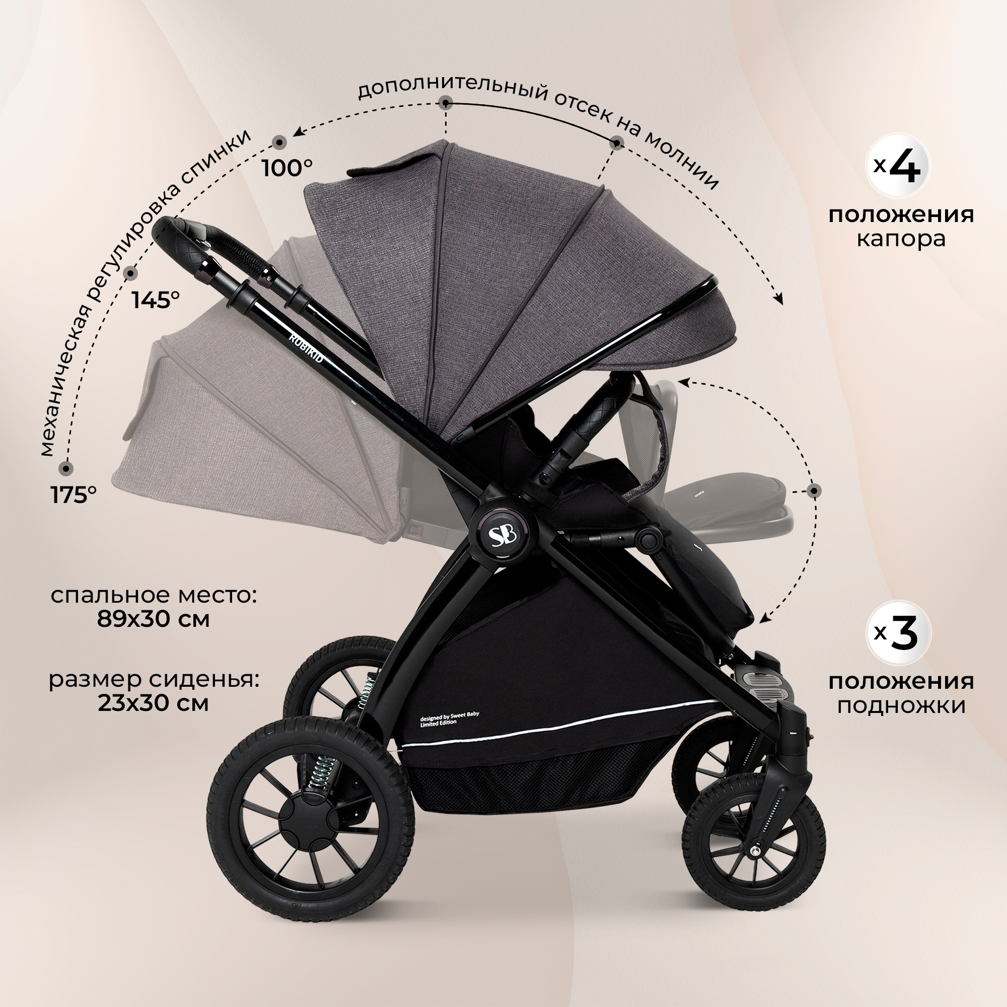 - прогулочный блок коляски Sweet Baby Rubikid способен выдерживать до 22 кг и отлично подойдет для детей до 4 лет;