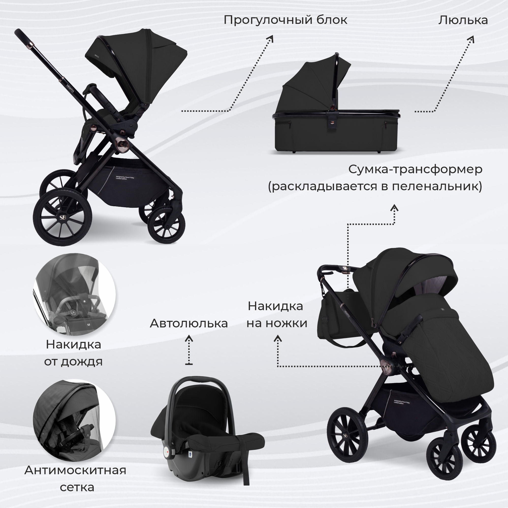 Комплектация: шасси, прогулочный блок, люлька, автокресло, дождевик, москитная сетка, сумка для мамы, накидка на ножки, адаптер, матрасик