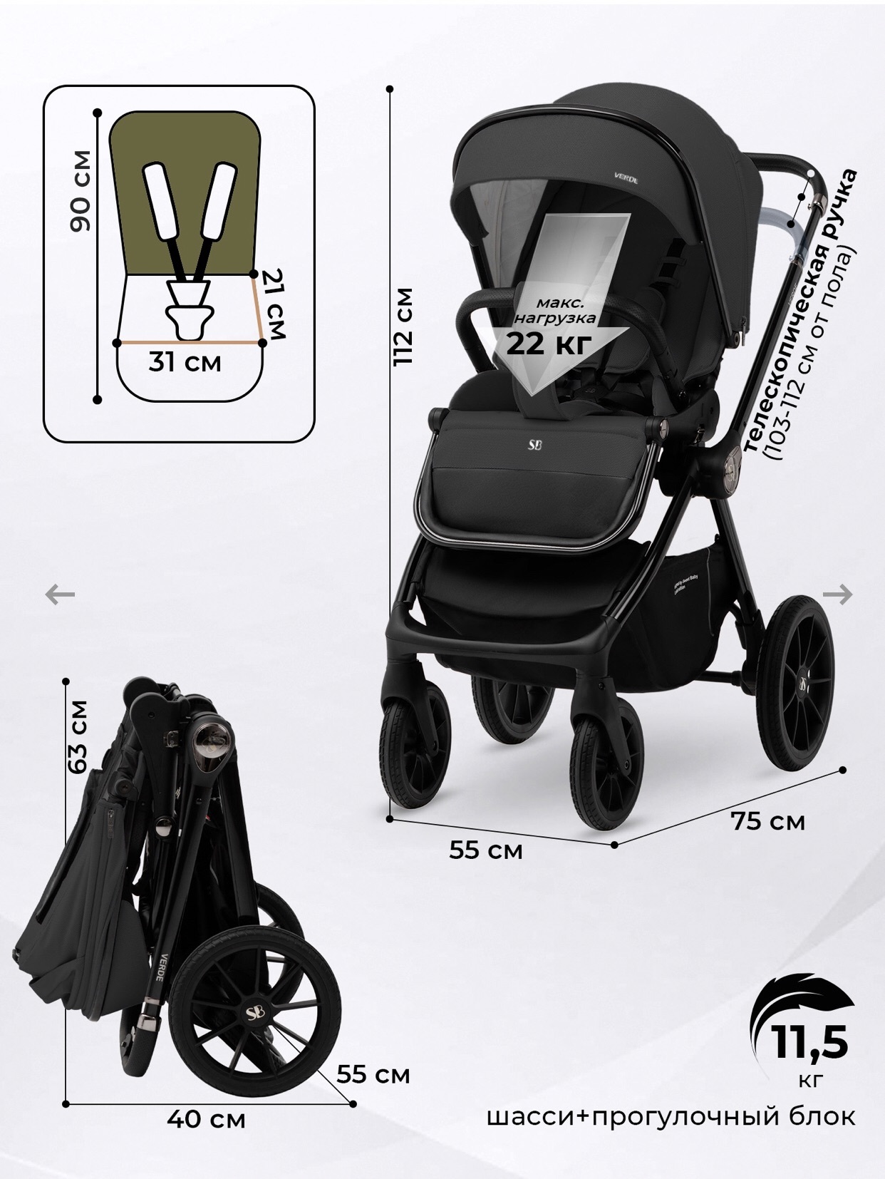 Коляска 3 в 1 для новорожденных с автолюлькой Sweet Baby Verde - отличный выбор для комфортных прогулок с вашим малышом! Большая высокая люлька, стильное глянцевое шасси, просторный регулируемый прогулочный блок делают коляску Sweet Baby Verde максимально комфортной для пользования. Коляска подойдет для детей от 0 до 4 лет или до достижения 22 кг .