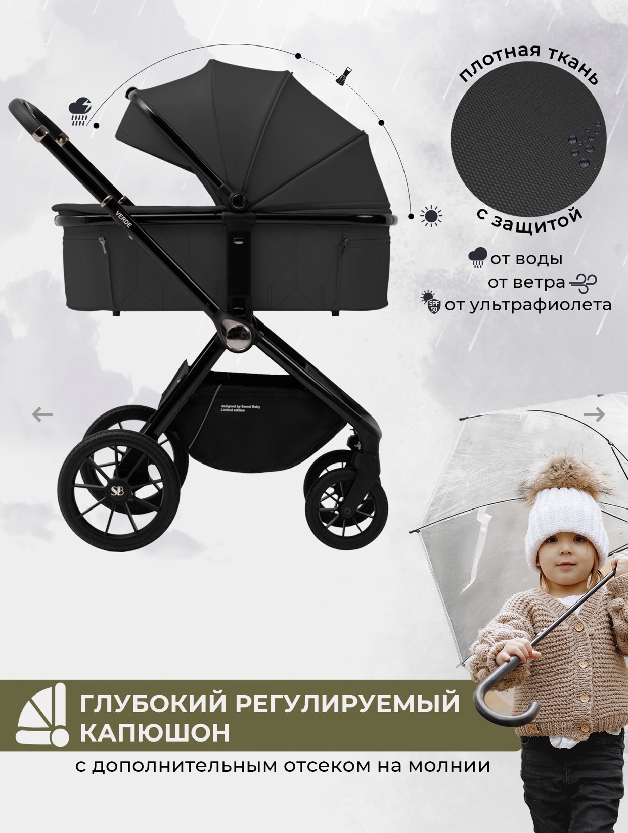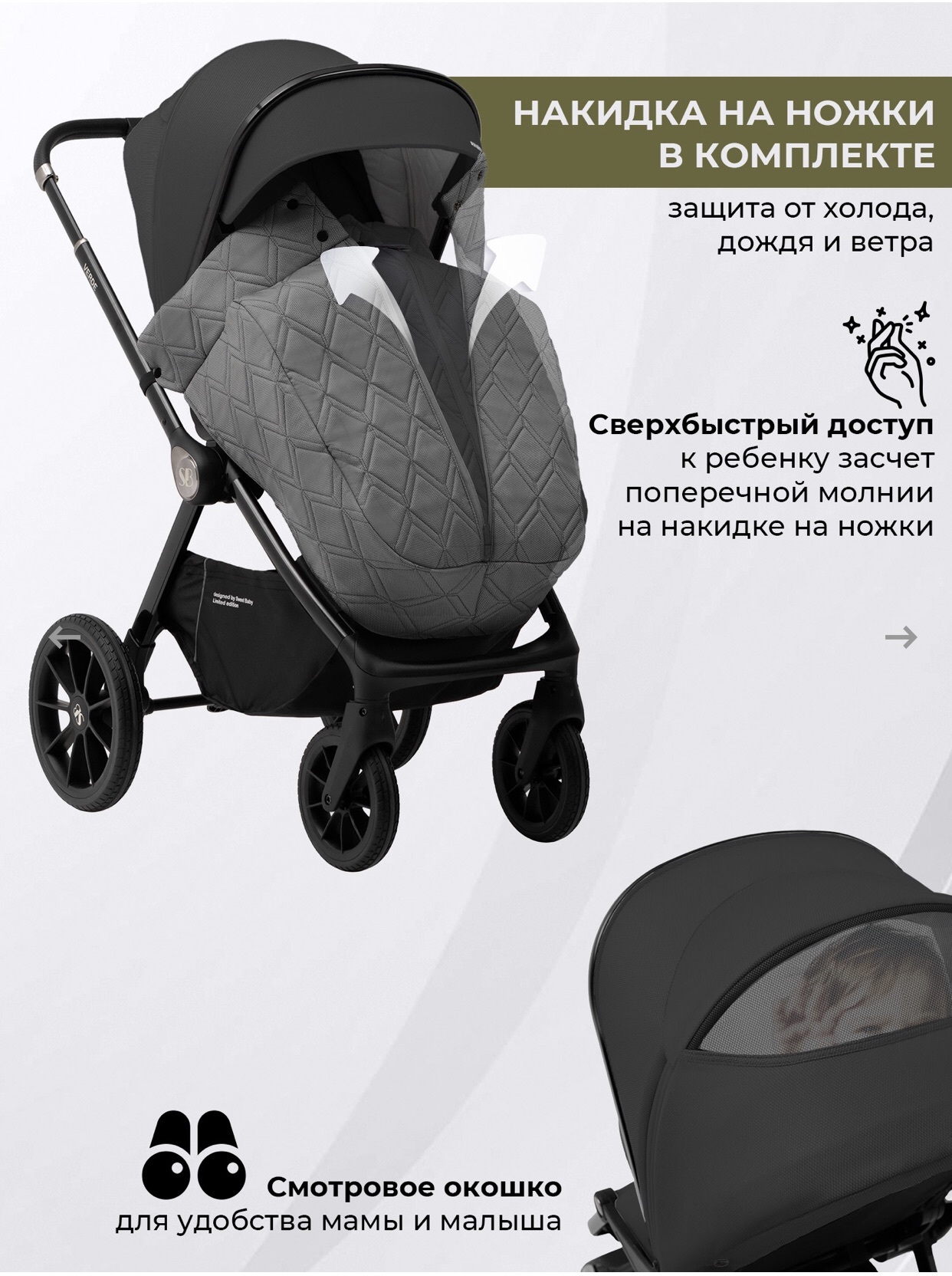- Накидка - распашонка защищает от непогоды и закрывается на магнитах, а также имеет окошко для наблюдения за ребенком;