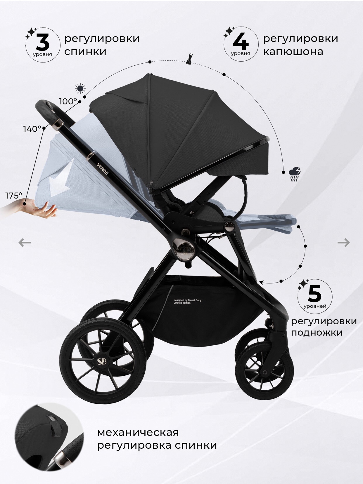 - Регулируемый подголовник для комфортного положения головы малыша;
