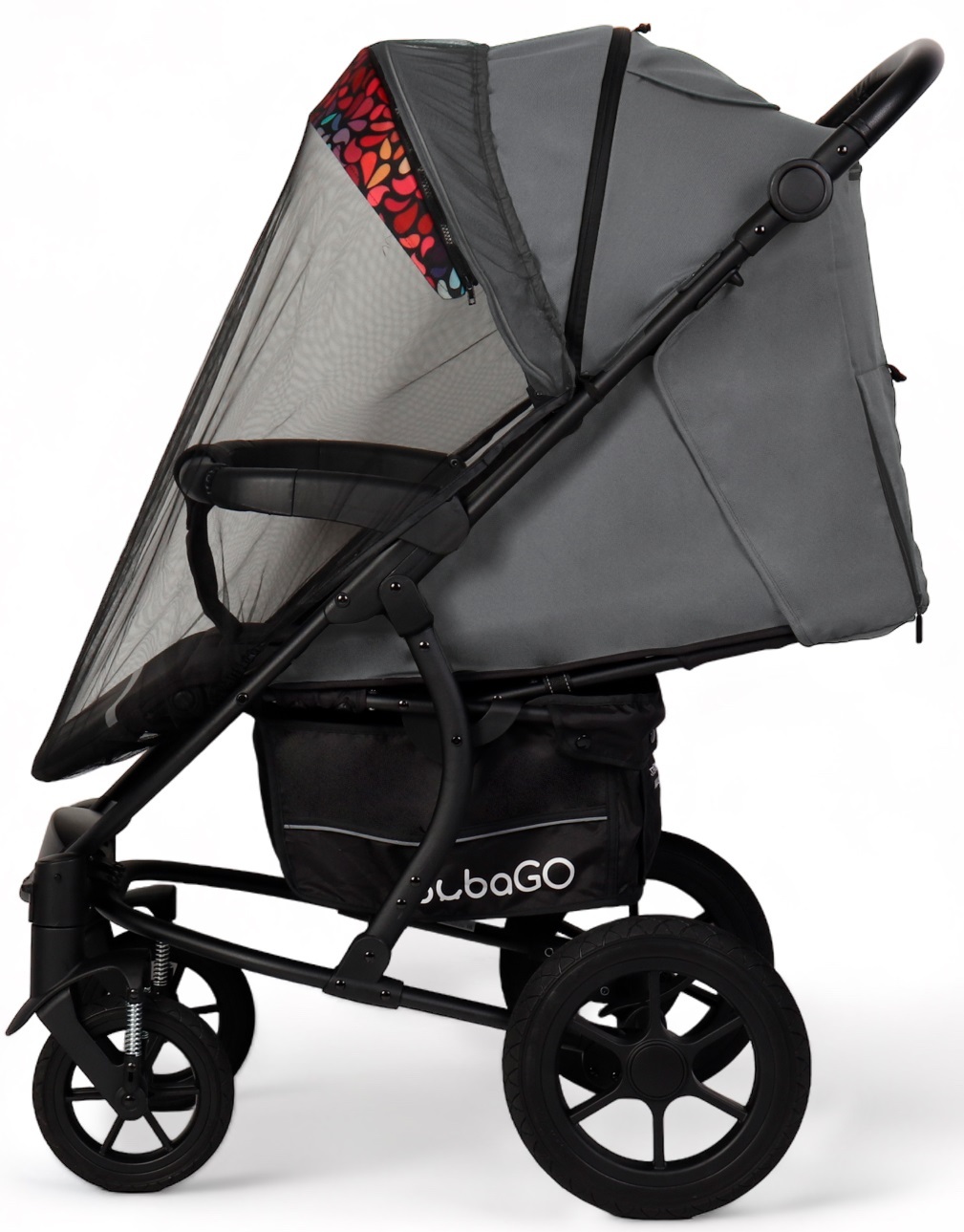 - Задняя стенка коляски полностью открывается для проветривания, а встроенная в нее москитная сетка помогает циркулировать воздух. В качестве системы безопасности в ней используются пятиточечные ремни, для надежной фиксации ребенка, съемный защитный бампер с эко кожей, механизм против сползания, педаль-тормоз на задние колеса.