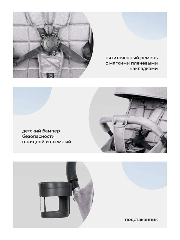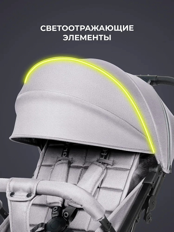 В сложенном состоянии прогулочная коляска стоит вертикально. Колеса с протектором изготовлены из материала EVA. Передние колеса вращаются на 360, что улучшает управляемость.