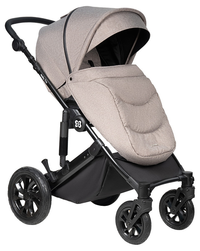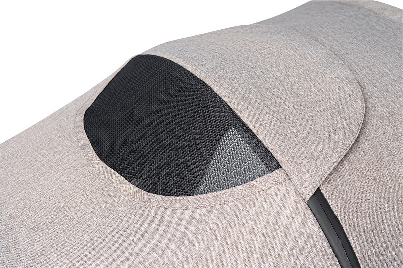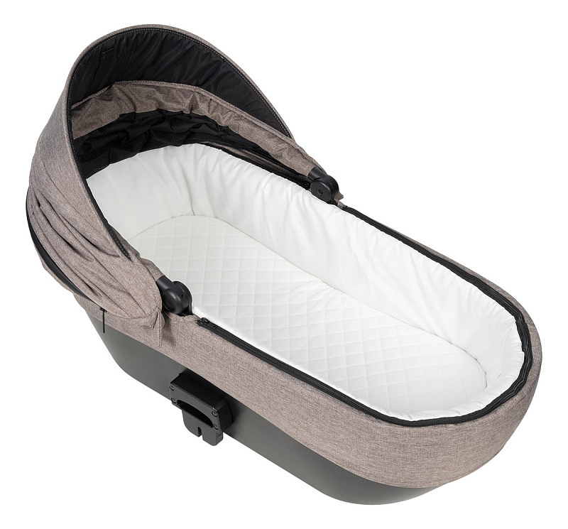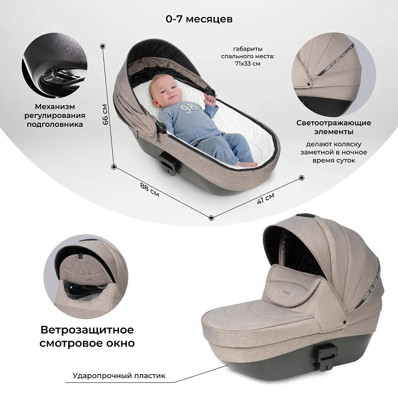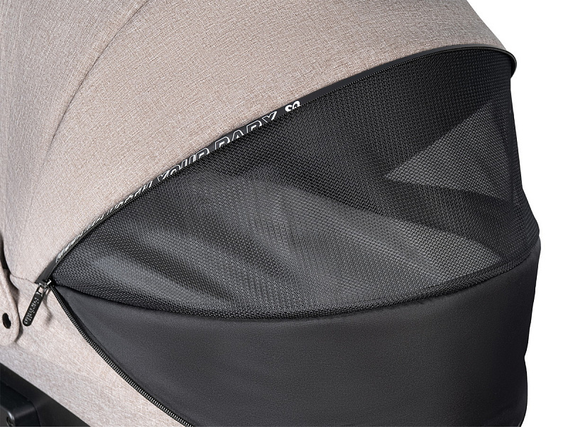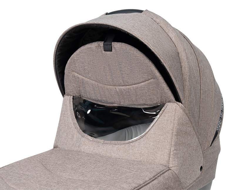 Люлька выполнена из ударопрочного пластика. По периметру люльки и на капюшоне расположена светоотражающая лента, которая обеспечивает безопасность в тёмное время суток. Для комфорта малыша внутри люльки предусмотрен съемный мягкий вкладыш, который выполняет роль бортиков и мягкий матрасик. Подголовник регулируется от 140 до 180 градусов. На капюшоне расположен защитный козырёк, скрытая секция из москитной сетки, ручка для переноски из экокожи. Широкий отворот на пологе служит для защиты от ветра и осадков, крепится к капюшону коляски.