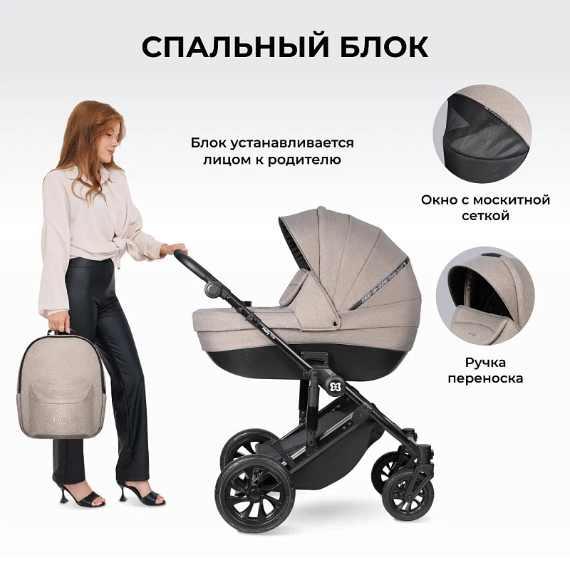 В комплекте: сумка/рюкзак, накидка на ножки в прогулочном блоке, накидка на люльку, насос для колёс, подстаканник, москитная сетка.