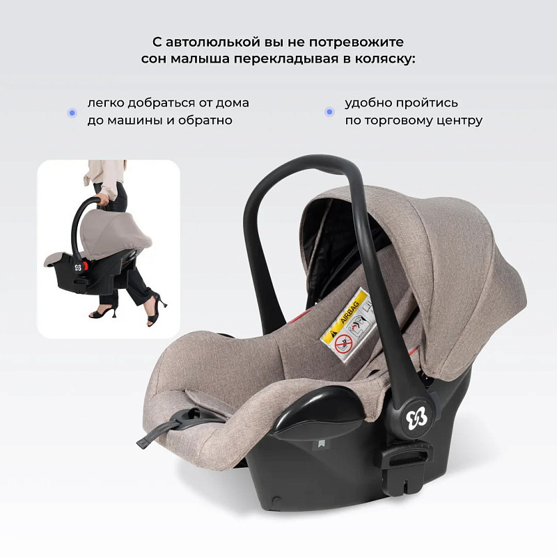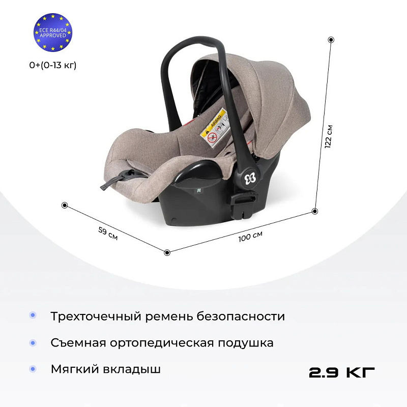 Автолюлька категории 0+(0-13 кг) стандарт безопасности ЕСЕ R44/04 с возможностью установки на раму коляски, оснащена трехточечным ремнем безопасности с мягкими накладками. Ручка для переноски в чехле из экокожи, регулируется в трёх положениях: спереди, сверху и сзади. В машине крепится штатными ремнями авто против хода движения.