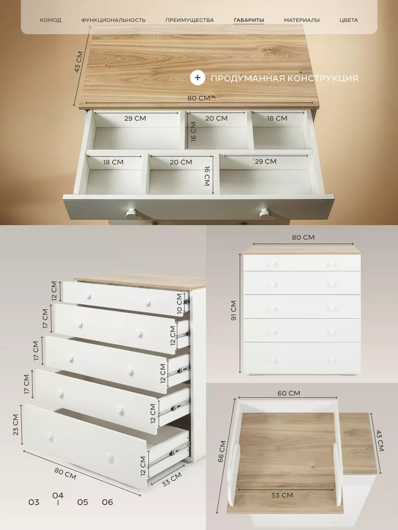 - практичные низкие ножки высотой 2 см предотвращают скопление пыли под комодом, поддерживая чистоту