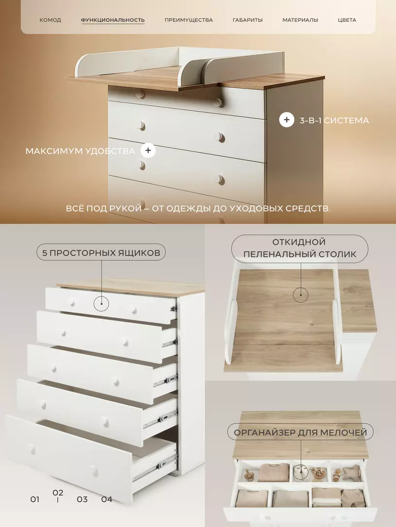 - 5 вместительных выдвижных ящиков бесшумны - они не потревожат спящего кроху