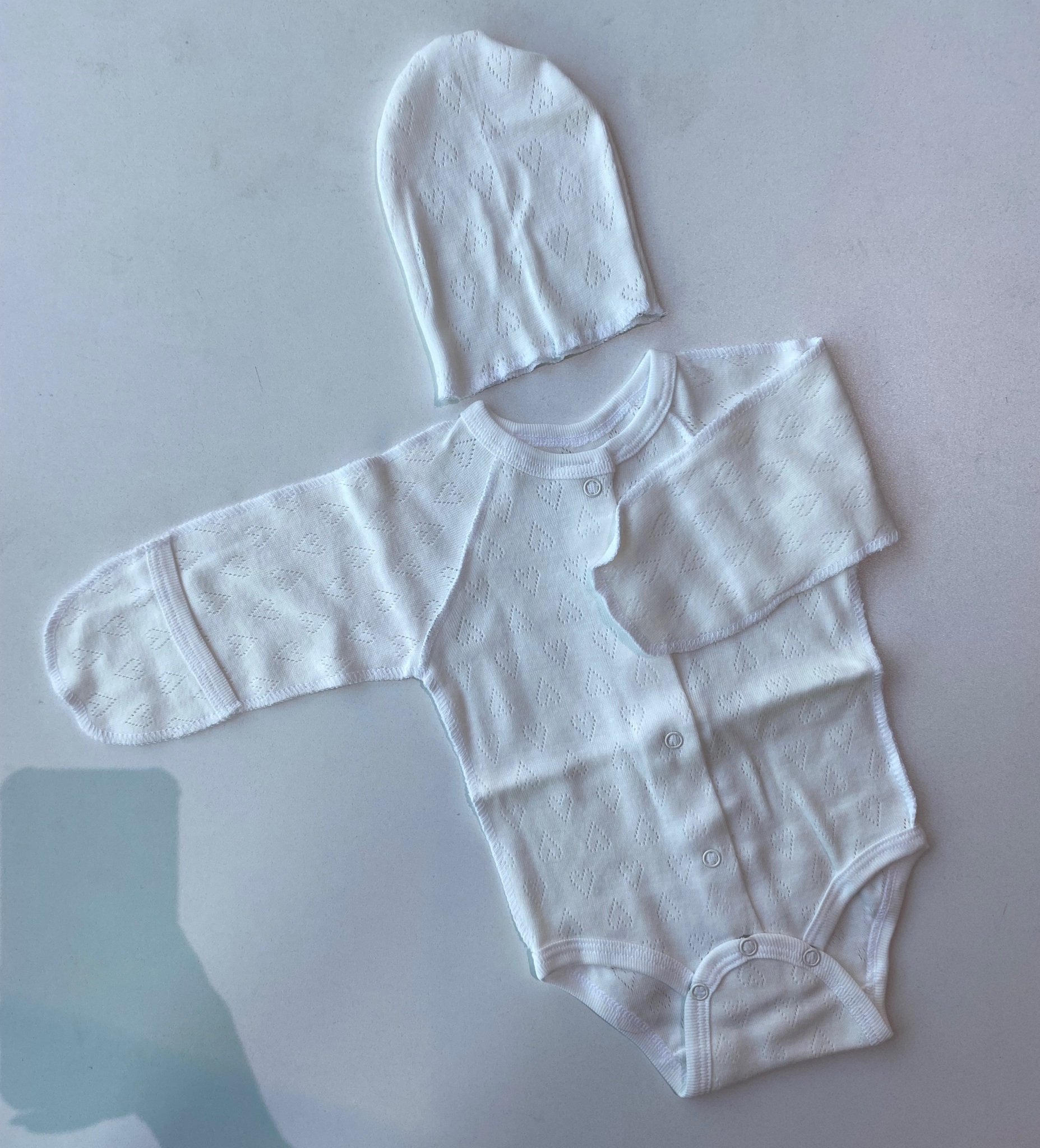 Уютный, мягкий комплект из 3 предметов – шапочка, боди и ползунки выполнен из 100% хлопка. Комплект смотрится невероятно нежно...