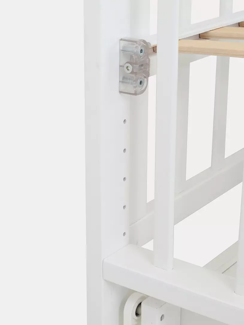 • съемную боковую стенку удобно опускать нажатием двух кнопок (курковый механизм). Также ее вовсе можно снять и, например, придвинуть к кровати родителей, чтобы обеспечить спокойный сон маме и малышу. Когда кроха вырастет, боковая стенка снимается - кровать превращается в уютный диванчик.