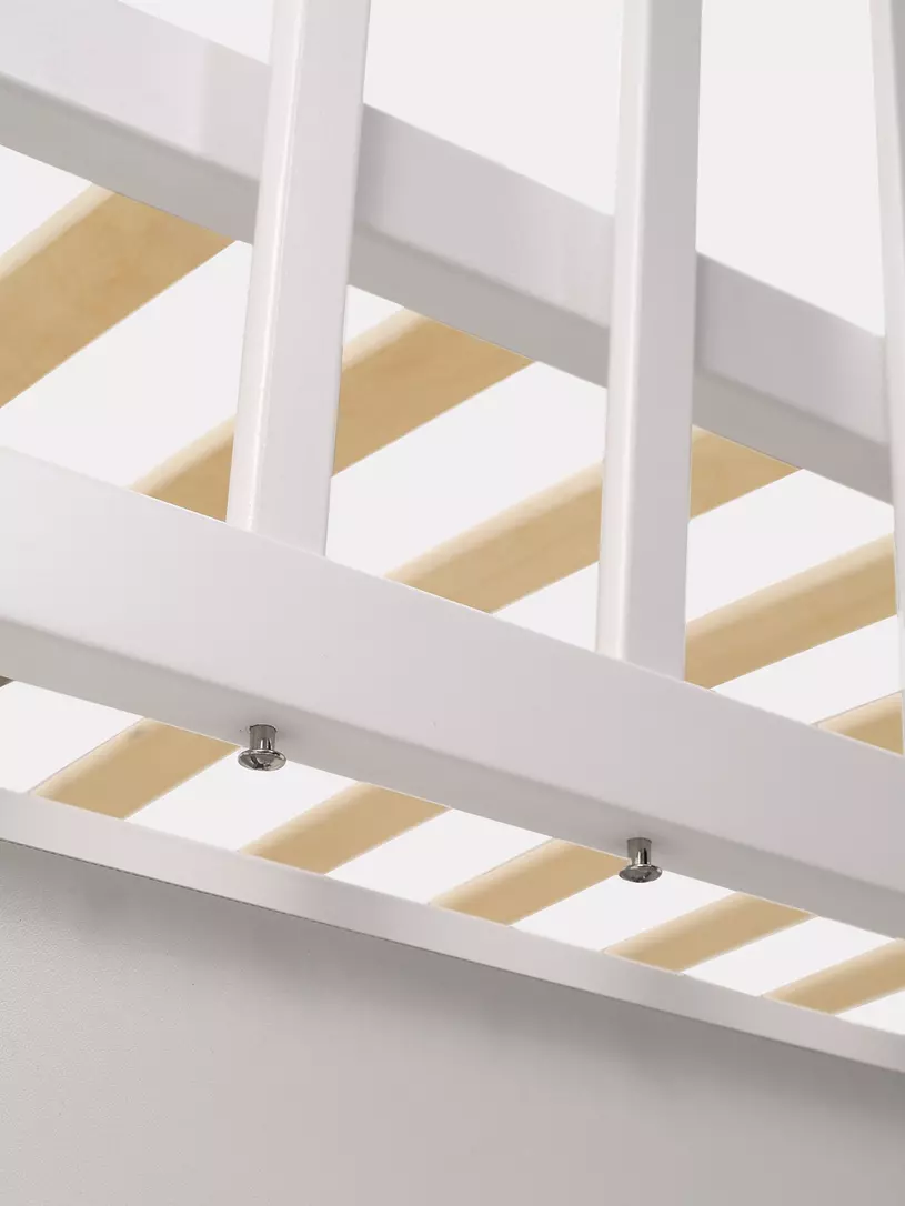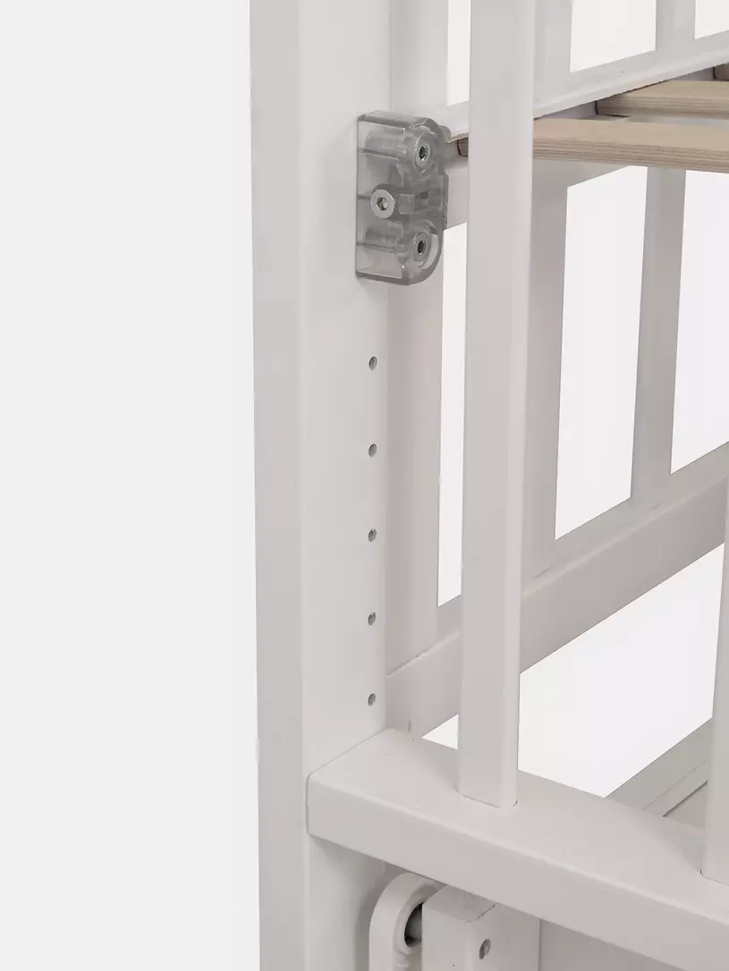 - съемную боковую стенку удобно опускать нажатием двух кнопок (курковый механизм). Также ее вовсе можно снять и, например, придвинуть к кровати родителей, чтобы обеспечить спокойный сон маме и малышу. Когда кроха вырастет, боковая стенка снимается - кровать превращается в уютный диванчик.