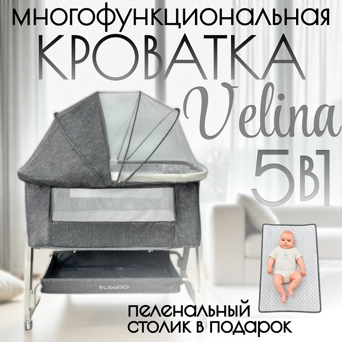 Детская кроватка BubaGO Velina 5в1 (бубагоу велина) - многофункциональная кроватка для ребенка с рождения до 15 кг, по очень приятной цене. Кроватка отличается простотой в использовании, полностью съемной обивкой, которую можно постирать, и необычной, большой комплектацией.