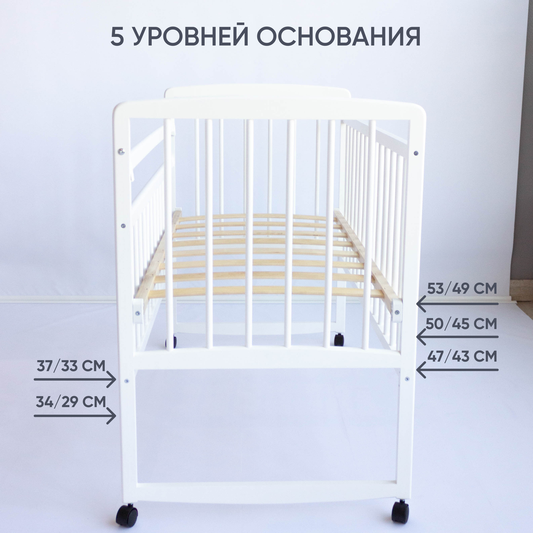 • Ложе может фиксироваться на 2х уровнях: верхний – пока ребенок совсем маленький, чтобы его проще было доставать с кроватки, нижний – когда малыш подрастет и сможет становиться на ножки
