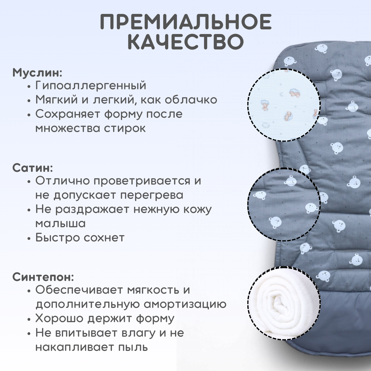 Он легко крепится, не скользит, защищает ткань и обивку от обуви и загрязнений. Подходит как для мальчиков, так и для девочек. Уход и долговечность Матрасик легко стирается, быстро сохнет и сохраняет форму. Благодаря качественным натуральным материалам он выдерживает многократные стирки, оставаясь таким же мягким, чистым и приятным к телу. Матрасик 2 в 1 из муслина и сатина — это универсальный аксессуар для комфорта вашего ребенка с первых дней жизни. Стильный, безопасный, многофункциональный — идеален для активных родителей и спокойных прогулок с новорожденным.
