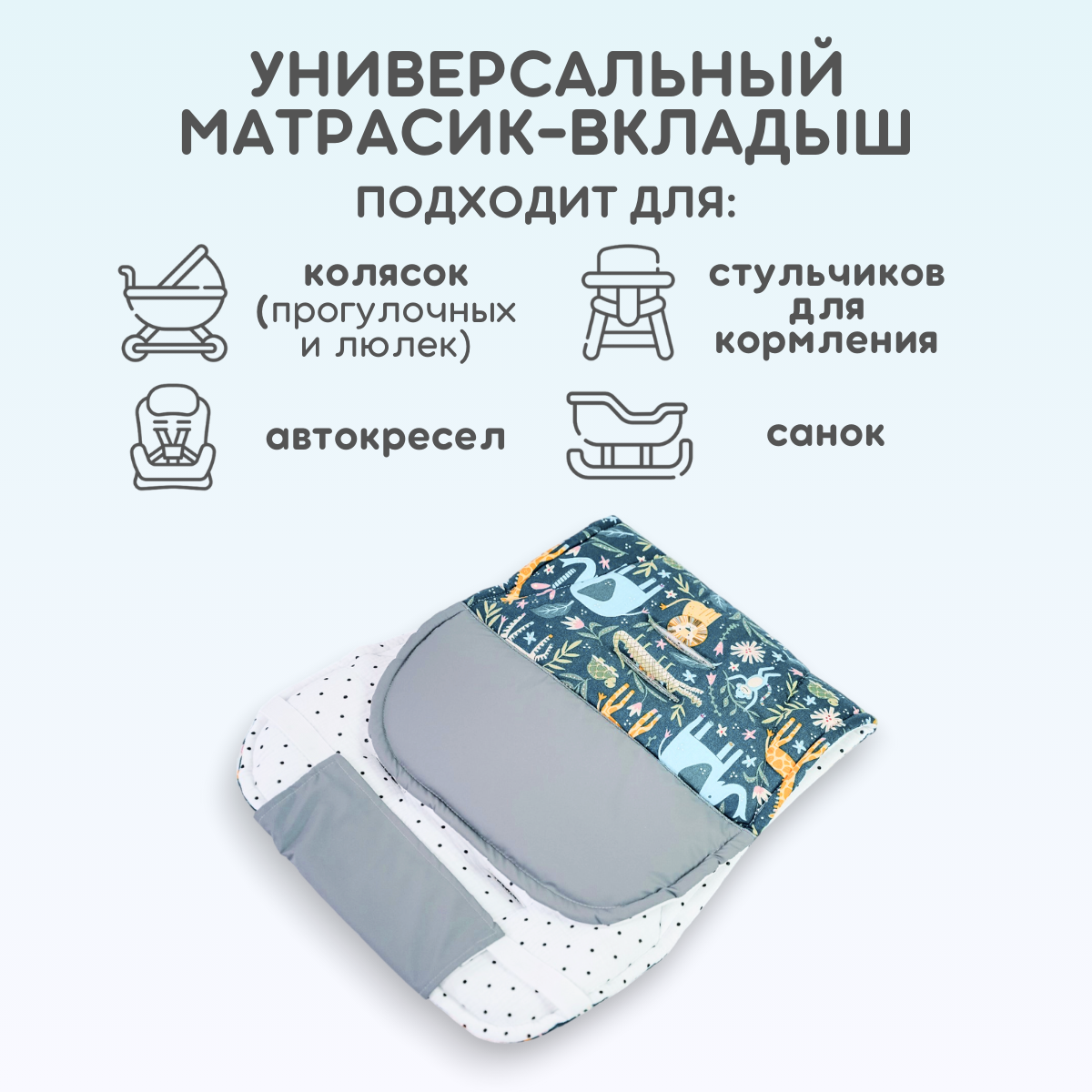 Универсальный детский матрасик для коляски, люльки, прогулочного блока, автолюльки, автокресла, шезлонга, кресла-качалки, стульчика для кормления и даже качелей. Подходит с рождения и обеспечивает максимум комфорта и безопасности для новорожденных, младенцев и маленьких детей.