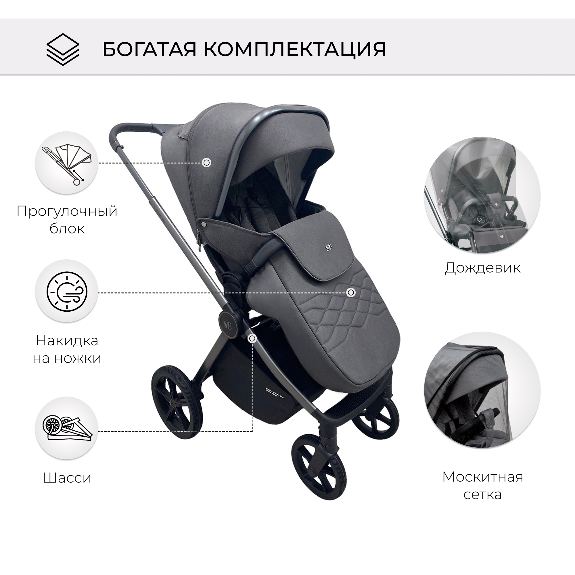 Прогулочный блок коляски Elegante обладает рядом удобных решений и особенностей, среди которых: