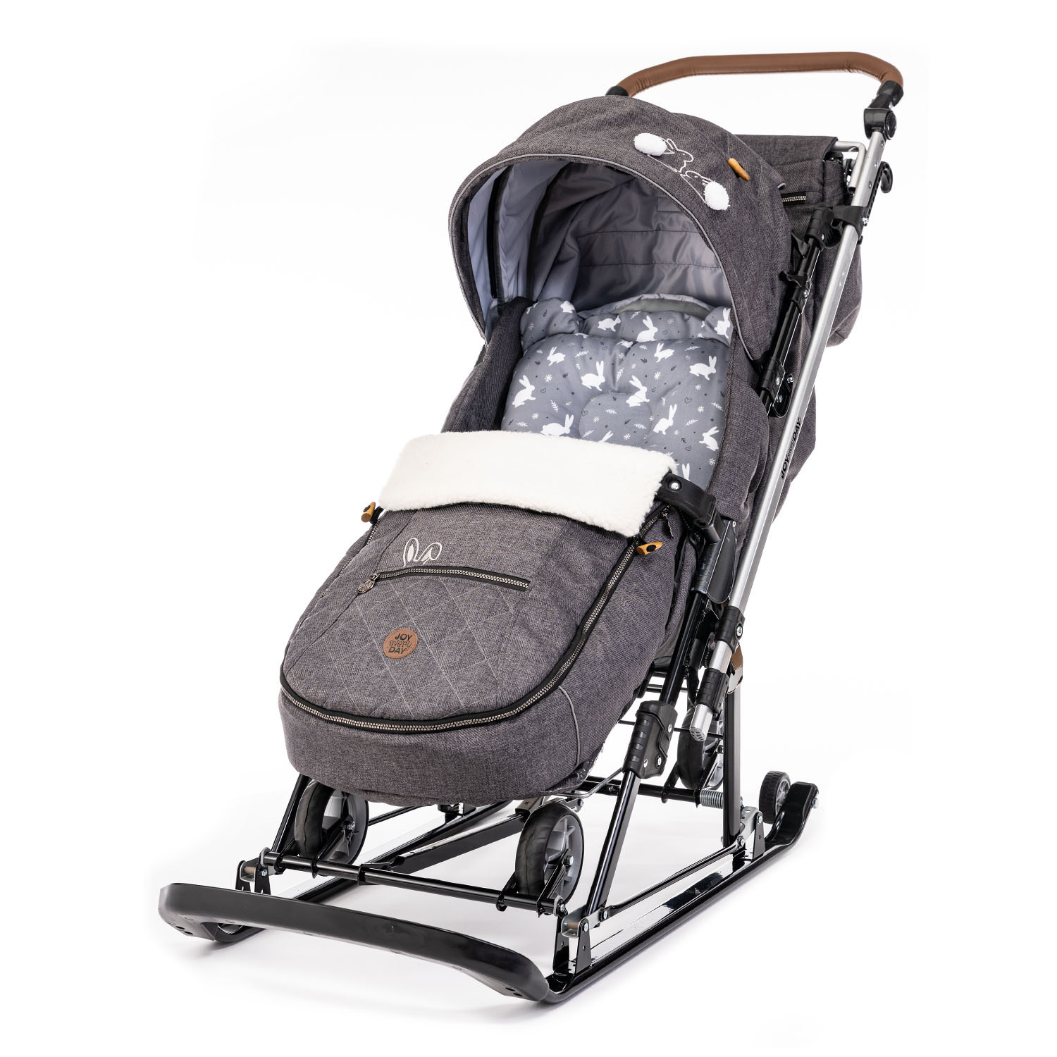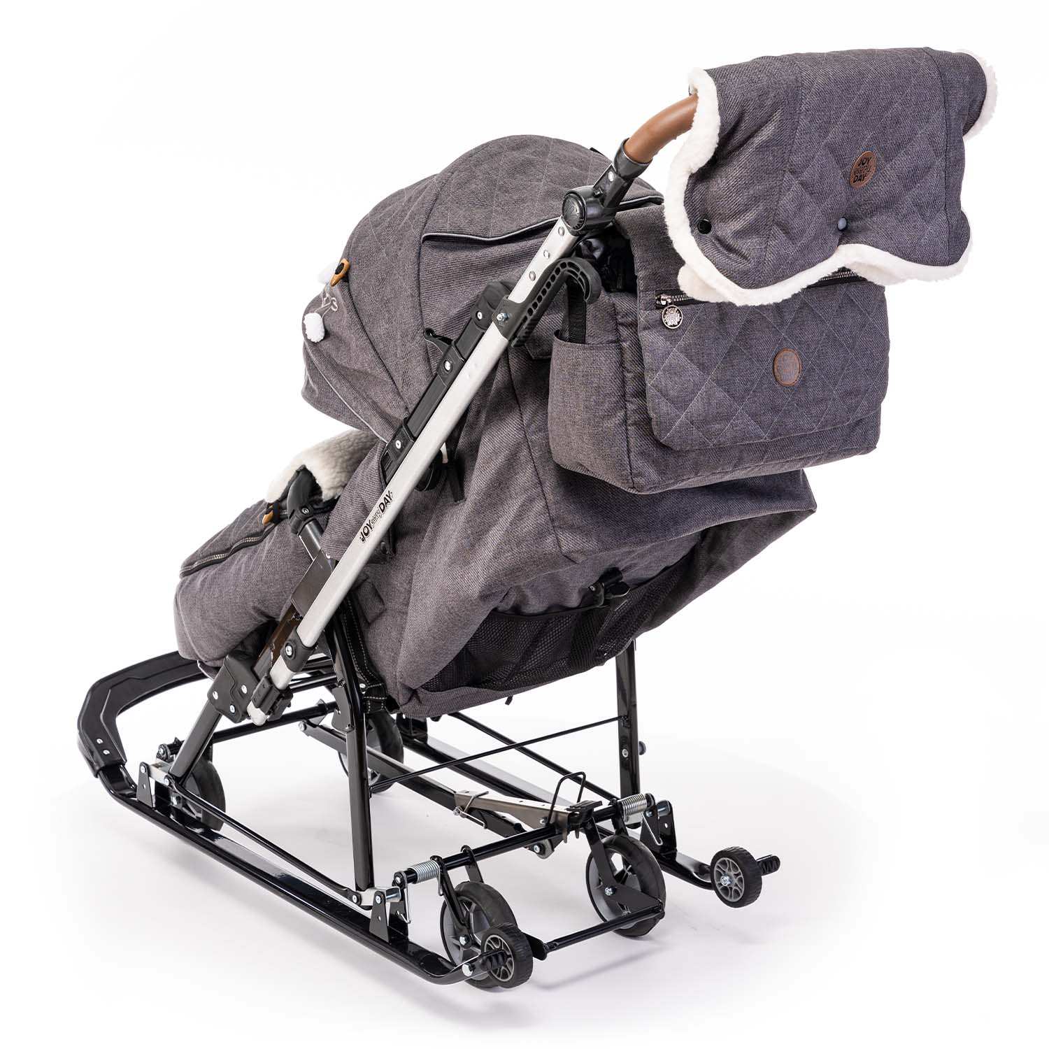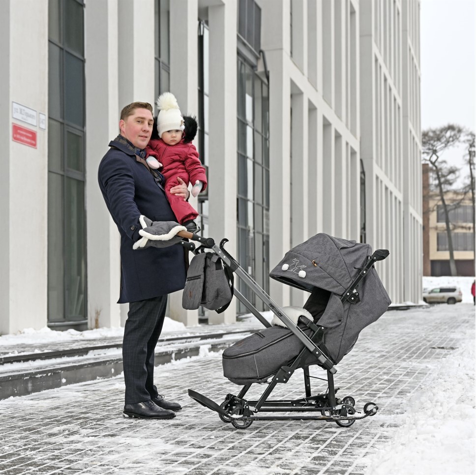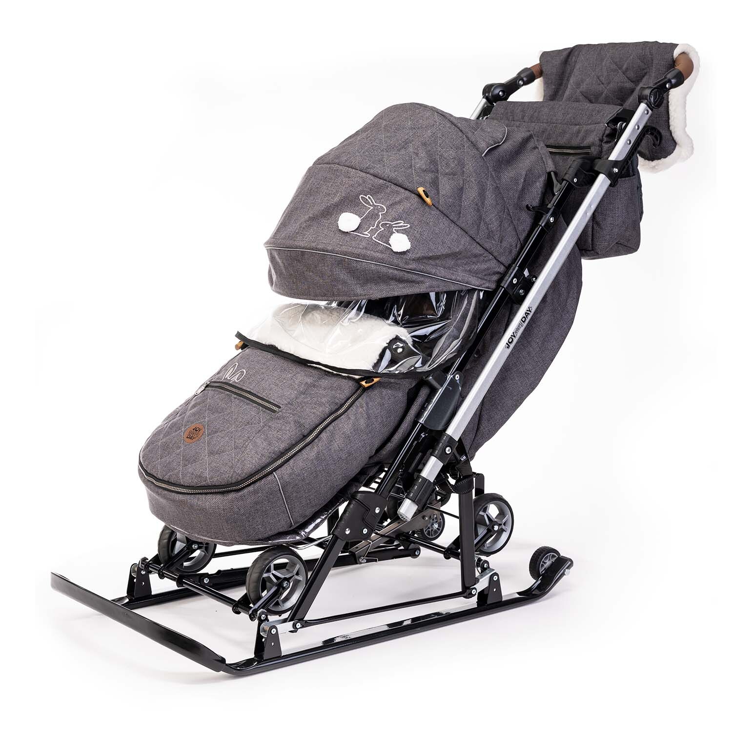 Предназначена для перевозки детей по плотному снегу и льду, оснащена выдвижными колесами на мягких шинах для перемещения по твердому покрытию (асфальт, плитка, бетон и др.)